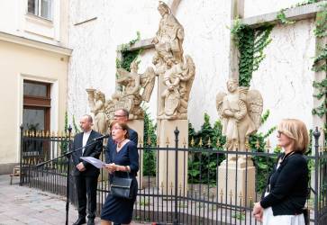 Zľava bratislavský pomocný biskup Jozef Haľko, veľvyslanec Poľskej republiky v SR Krzysztof Strzałka, autorka výstavy profesorka Emília Hrabovec a námestníčka primátora Bratislavy Lucia Štasselová pri otvorení výstavy. Snímka: Erika Litváková/KN