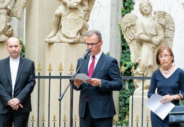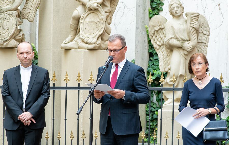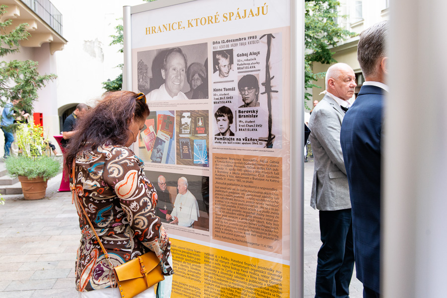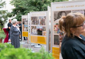 Zľava bratislavský pomocný biskup Jozef Haľko, veľvyslanec Poľskej republiky v SR Krzysztof Strzałka, autorka výstavy profesorka Emília Hrabovec.Snímka: Erika Litváková/KN