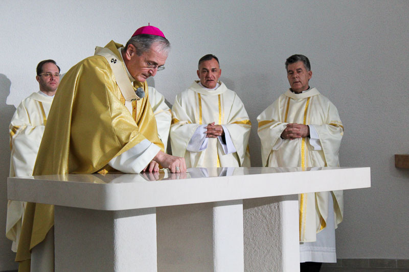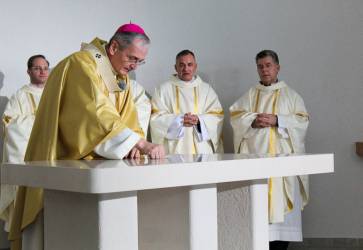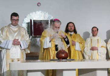 Arcibiskup Stanislav Zvolenský po homílii a litániách vložil do oltára relikvie sv. Filipa a Jakuba, patrónov kostola. Snímka: Monika Šimoničová