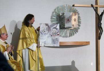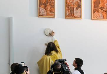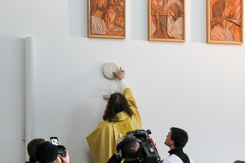 Po konsekračnej modlitbe a pomazaní oltára farár pomazal štyri konsekračné kríže na stenách kostola. Snímka: Monika Šimoničová