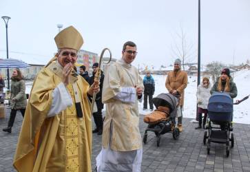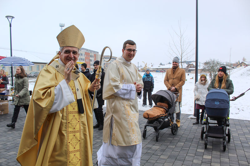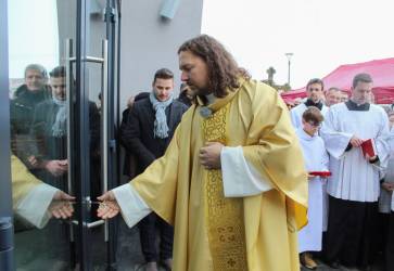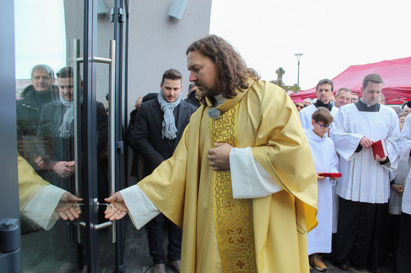 Farár Gabriel Klenko po obrade odovzdania kľúčov slávnostne odomkol nový kostol. Snímka: Monika Šimoničová