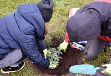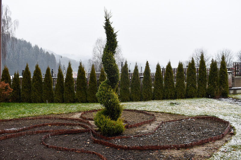 Okolo okrasnej tuje vysockí farníci vysadili 1 200 bielych tulipánov. Je to miesto, odkiaľ sa prehliadka biblickej záhrady začína. Snímka: KN/Monika Šimoničová