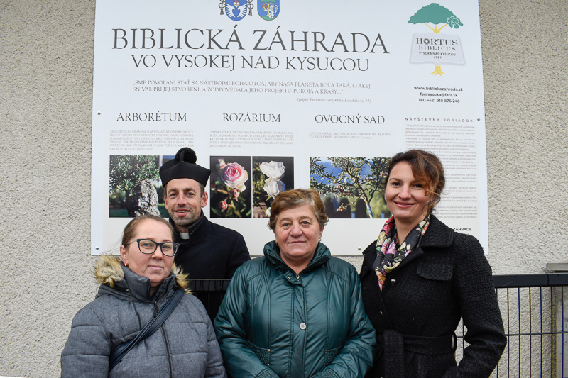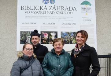 Iniciátorom biblickej záhrady bol farár František Mikuláš s aktívnymi farníčkami (zľava): Lenka Chovancová, Marta Delinčáková, Kamila Gabošová. Snímka: KN/Monika Šimoničová