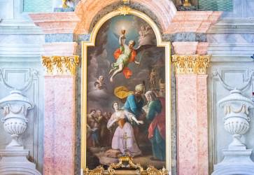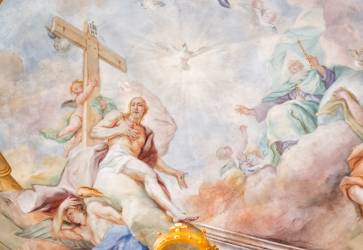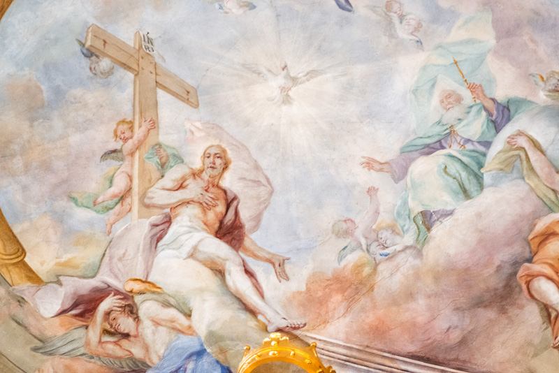 Vo svätyni je nad oltárom iluzívna maľba – priehľad cez otvor v klenbe do voľného neba s Najsvätejšou Trojicou a centrálnym motívom holubice ako Ducha Svätého. Snímka: Erika Litváková