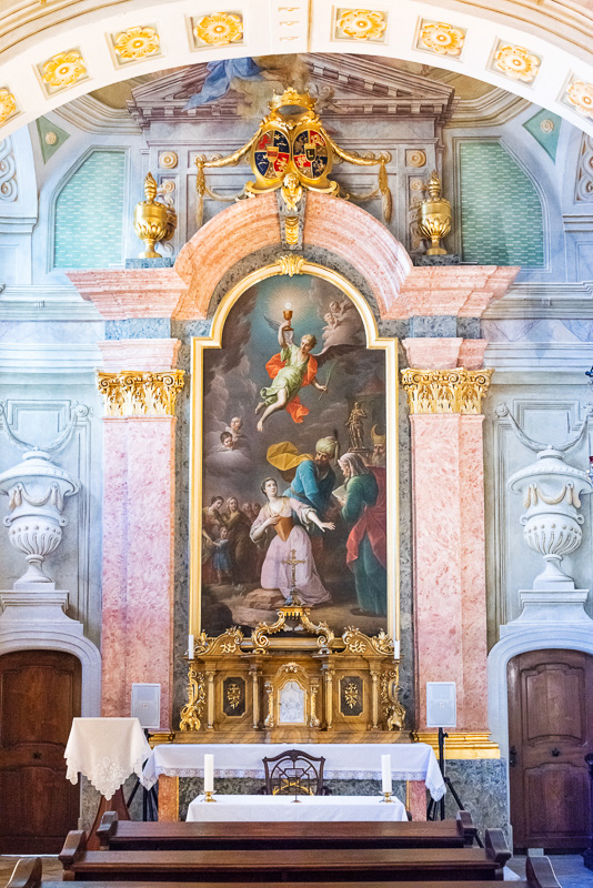 Oltárny obraz od neznámeho maliara znázorňuje mučenie sv. Barbory, patrónky kaplnky. Podľa legendy ju sťal mečom vlastný otec, ktorého krátko po jej smrti zasiahol blesk a priviedol ho tak pred Boží súd. Snímka: Erika Litváková