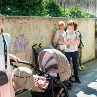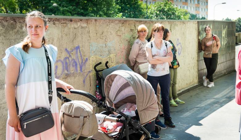 Už krátko po otvorení centra čakalo v rade niekoľko utečencov, medzi nimi aj mamičky s deťmi. Snímka: Erika Litváková