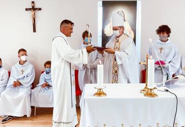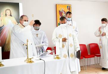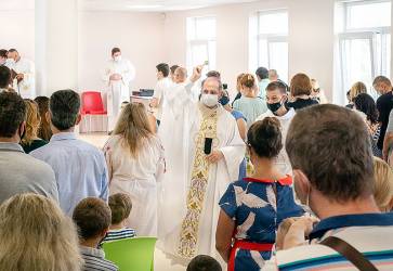 Slávnostnú svätú omšu v školskej jedálni slávil bratislavský arcibiskup Stanislav Zvolenský. Snímka: Ján Lauko