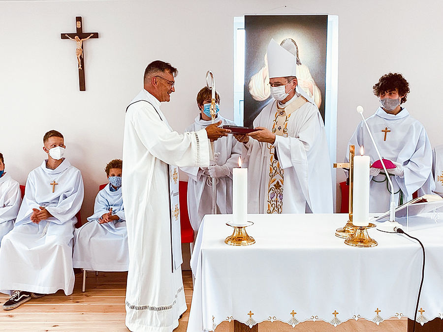 Miestny dekan Robert Masicza (stojaci vľavo) privítal arcibiskupa opäť po roku. Snímka: acrhív farnosti Štvrtok na Ostrove