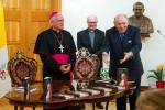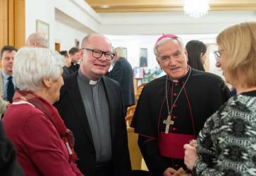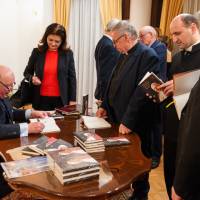 Riaditeľ Spolku svätého Vojtecha Ivan Šulík (vľavo) bol vďačný, že prezentácia knihy sa mohla konať na apoštolskej nunciatúre za prítomnosti nuncia Nicolu Girasoliho. Snímka: Katolícke noviny/Erika Litváková