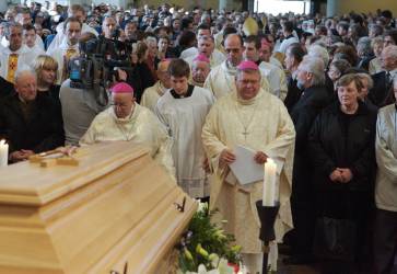 Liturgická farba na pohrebe Pavla Máriu Hnilicu v októbri 2006 v Trnave bola biela – slávnostná. Snímka: Peter Zimen