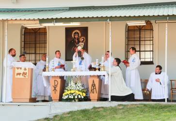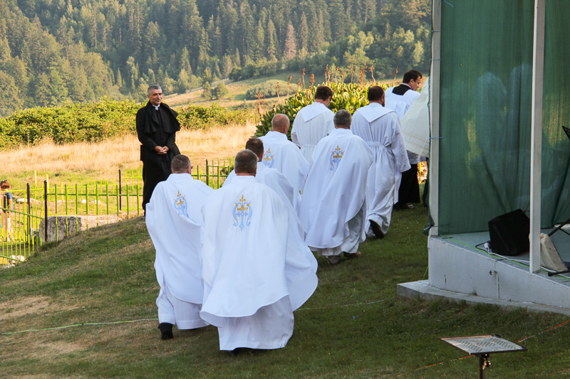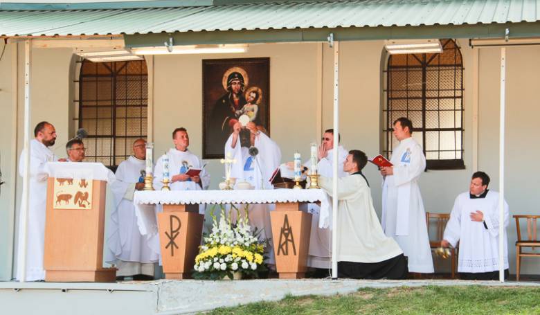 Úvodnú svätú omšu v sobotu 6. augusta slúžil Rastislav Polák, generálny vikár Rožňavskej diecézy. V pozadí vidno reprodukciu obrazu Panny Márie Rožňavskej. Snímka: Dana Cikhartová