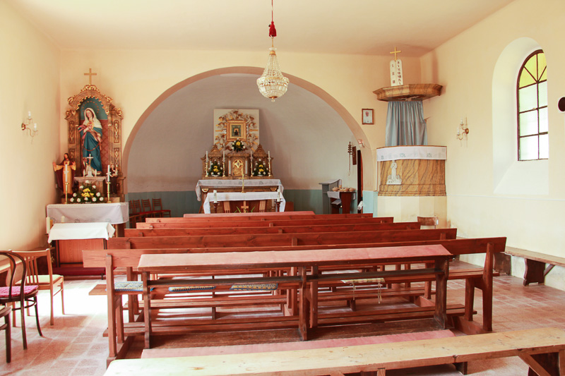Interiér Kaplnky Panny Márie Snežnej vybudovanej kňazom Štefanom Herkom z vďačnosti za uzdravenie a posvätenej 10. augusta 1941. Na oltári je kópia obrazu Čiernej Madony. Snímka: Dana Cikhartová