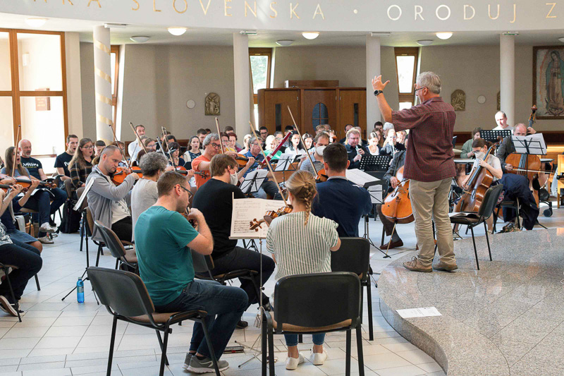 Hudobné sprevádzanie svätej omše, ktorú celebroval Svätý Otec v Šaštíne 15. septembra, bola úloha, na ktorú sa zodpovedne pripravovali všetci zúčastnení. V príprave sa do najbližšej spolupráce k pátrovi Vlastimilovi Dufkovi, SJ, pridal Vladimír Kopec, organista a zbormajster v Katedrále sv. Emeráma v Nitre. Na orchestrálnych úpravách sa podieľal skladateľ a violončelista Gregor Regeš a hudobník Ondřej Múčka z Česka. Vďaka šiestim zbormajstrom si jednotlivé chrámové zbory naštudovali individuálne spevy. Hudobné teleso malo 130 členov.
