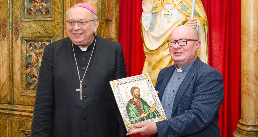 Mons. Ján Orosch (vľavo) daroval riaditeľovi SSV Ivanovi Šulíkovi ikonu sv. Jána Krstiteľa, patróna Trnavskej arcidiecézy. Snímka: Erika Litváková