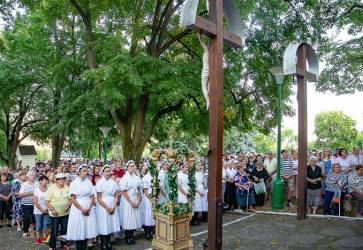 Súčasťou škapuliarskej púte v Topoľčiankach bol aj tradičný obrad zverenia dievčat Panne Márii Karmelskej. Snímka: Člověk a víra/Mária Švecová
