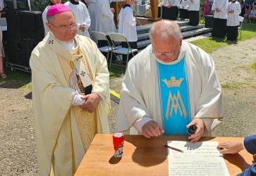 Pri príležitosti obnovy exteriéru diecéznej svätyne uložili do kostolnej veže v Stropkove časovú schránku, v ktorej je aj listina s podpismi košického arcibiskupa, miestneho farára, primátora mesta a župana. Snímka: Jaroslav Fabian