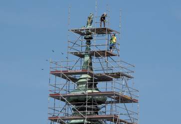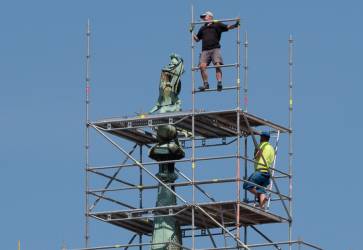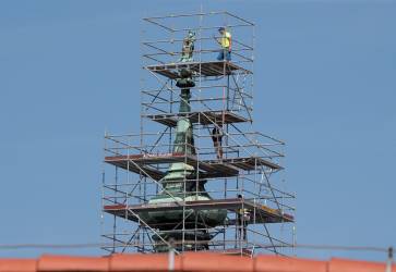 Sňatie plastiky sv. Michala Archanjela z hrotu strechy Michalskej veže a jej následné reštaurovanie je súčasťou aktuálnej generálnej obnovy veže. Snímka: Erika Litváková