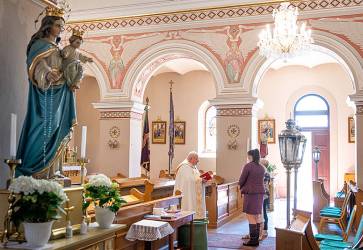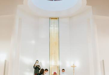 Svetlo je vnútri Kostola sv. Rity, i keď sa vonku zotmie. Je znázornené na prednej stene vertikálnym pásom zlatej farby, ktorá je symbolom nebeského svetla. V poli zlatého pásu je umiestnený svätostánok. Snímka: archív rehole augustiniánov