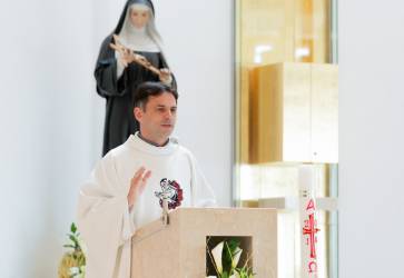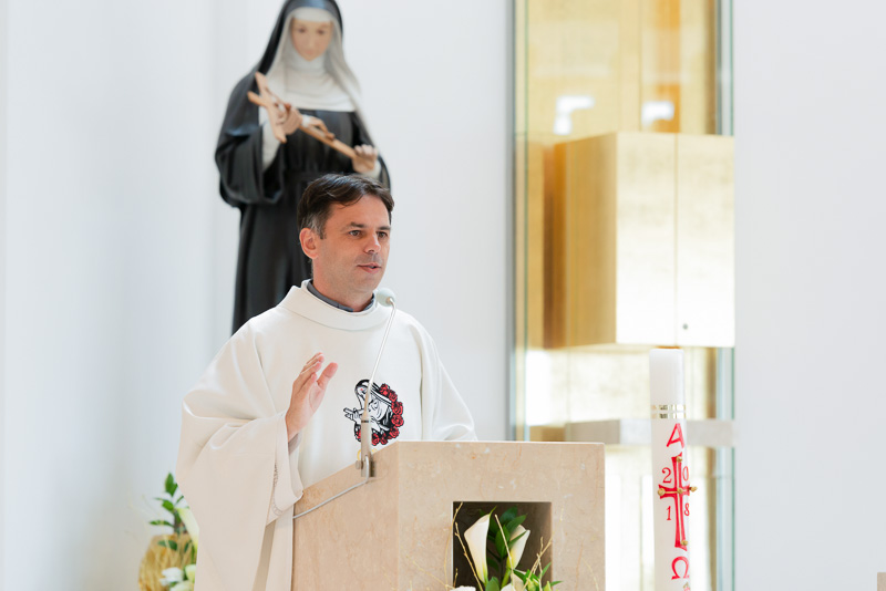 Predstavený rehole augustiniánov na Slovensku Juraj Pigula, OSA, počas homílie v Kostole sv. Rity v Košickej Novej Vsi. V pozadí je socha svätice z Cascie. Snímka: archív rehole augustiniánov