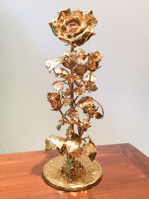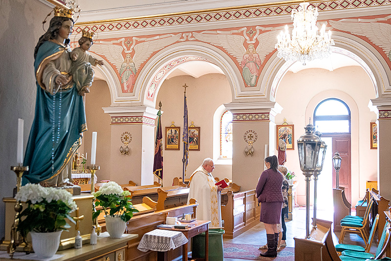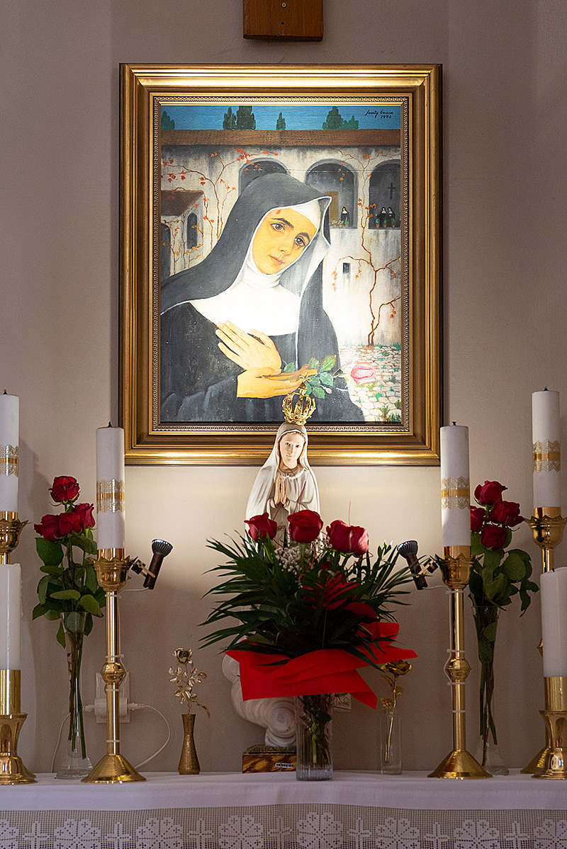 Obraz sv. Rity namaľovala maďarská umelkyňa Masa Fesztyová. Ružu v kostole badať viackrát. Ako mariánsky symbol i symbol sv. Rity, ku ktorej do Zlatých Klasov prichádzajú i pútnici spoza hraníc. Snímka: Erika Litváková