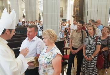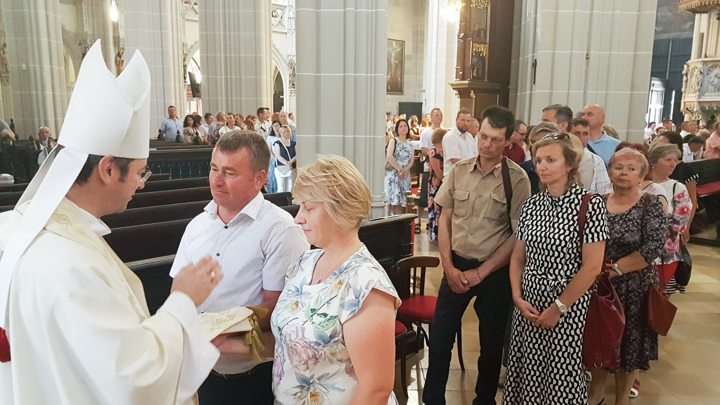 Po svätej omši v Katedrále sv. Alžbety v Košiciach viac ako sto jubilujúcich párov manželov prijalo z rúk otcov biskupov osobitné požehnanie. Snímka: Jaroslav Fabian