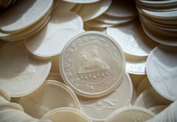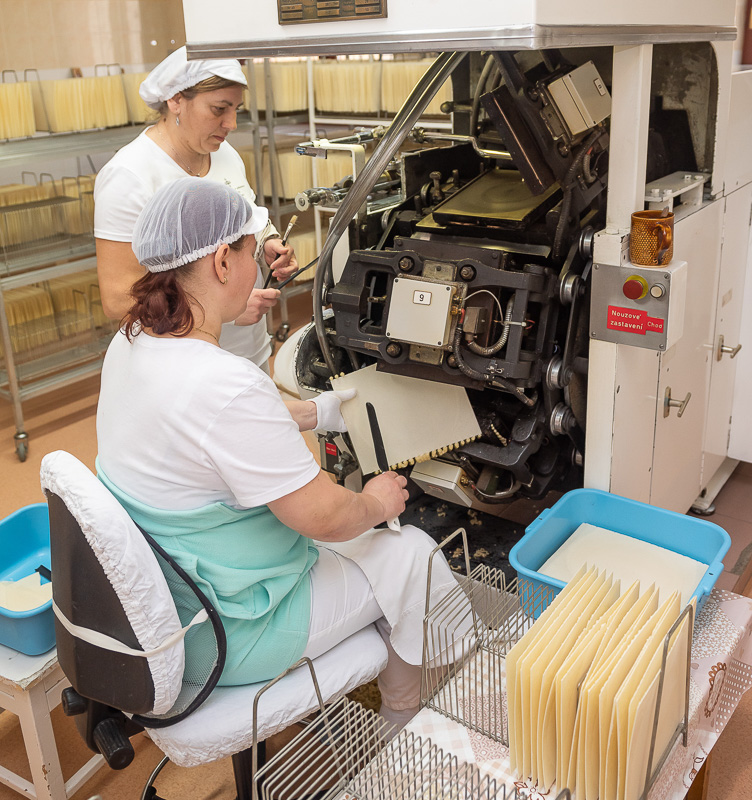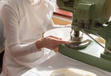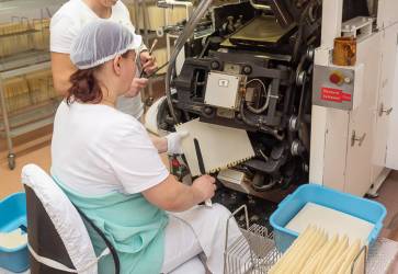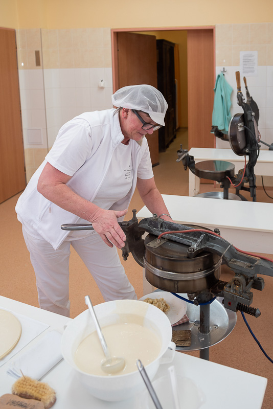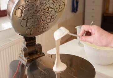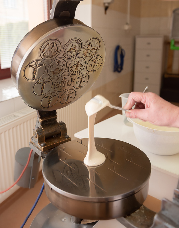 Tenké hostie sa pečú ručne. Pani Marienka naleje cesto na horúcu spodnú platňu, pritlačí hornou, chvíľu nechá v stroji, kým sa voda vyparí a vyberie upečenú hostiu.Snímka: Peter Dobrovský