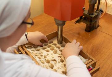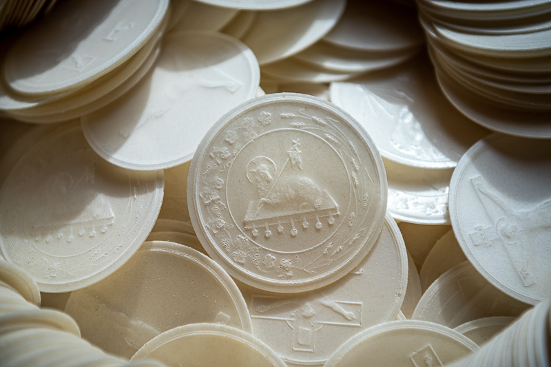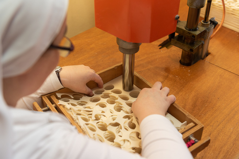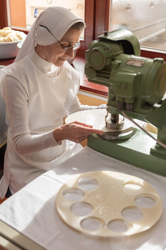 Sestra Damiána vykrajuje kňazské hostie. Každú zvlášť podľa vzoru vytlačeného na upečenom pláte. Snímka: Peter Dobrovský