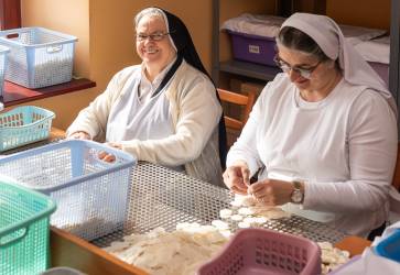 Pri poslednej fáze, preberaní hostií, sa sestry spolu pomodlia, porozprávajú, ale aj zasmejú, pretože ich práca baví. Pomáhať chodia aj sestry z DSS. Snímka: Peter Dobrovský