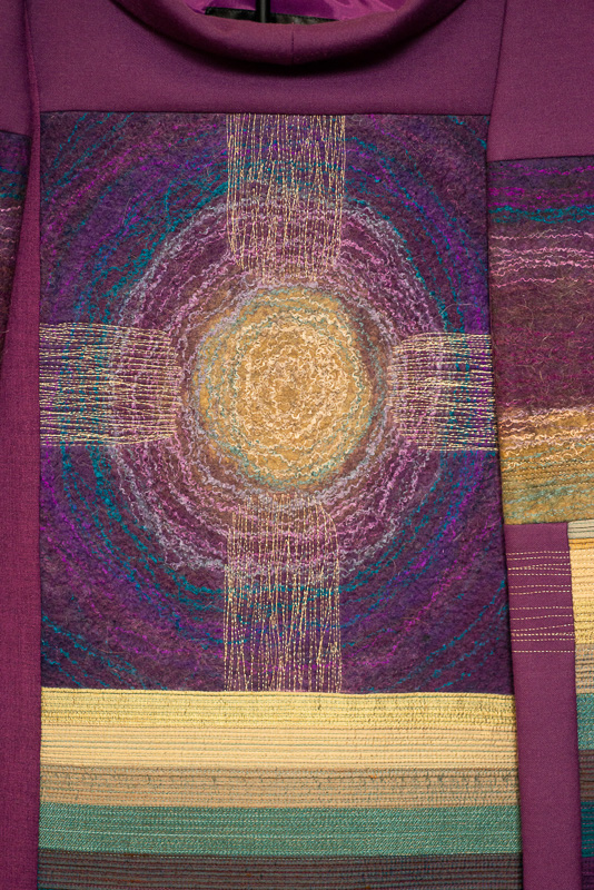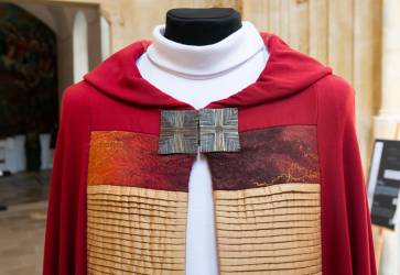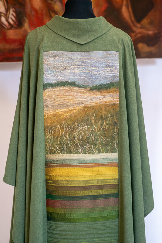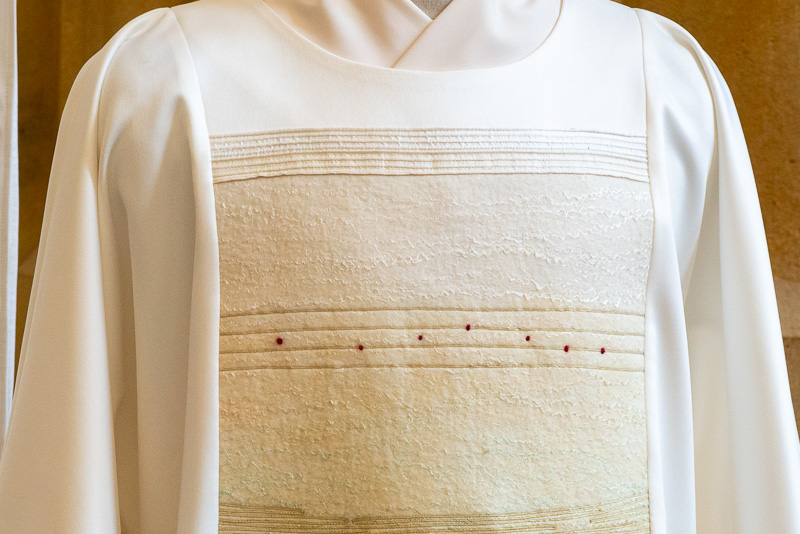 Výšivka na dalmatike cituje gregoriánsky notový zápis sekvencie zodpovedajúcej liturgii sviatku Sedembolestnej Panny Márie: Stabat Mater dolorosa (Stála Matka bolestivá). Snímka: Erika Litváková