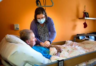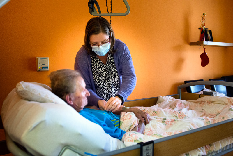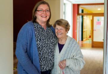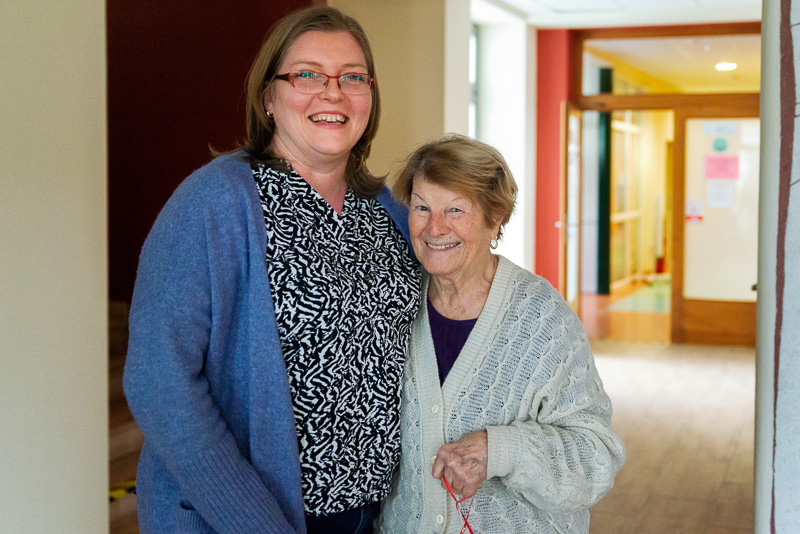 Do hospicu chodí pravidelne pomáhať aj dobrovoľníčka Mária (vpravo). Má síce po osemdesiatke, no stále aj pozitívnu náladu, ktorú rozdáva ďalej. Snímka: KN/Erika Litváková