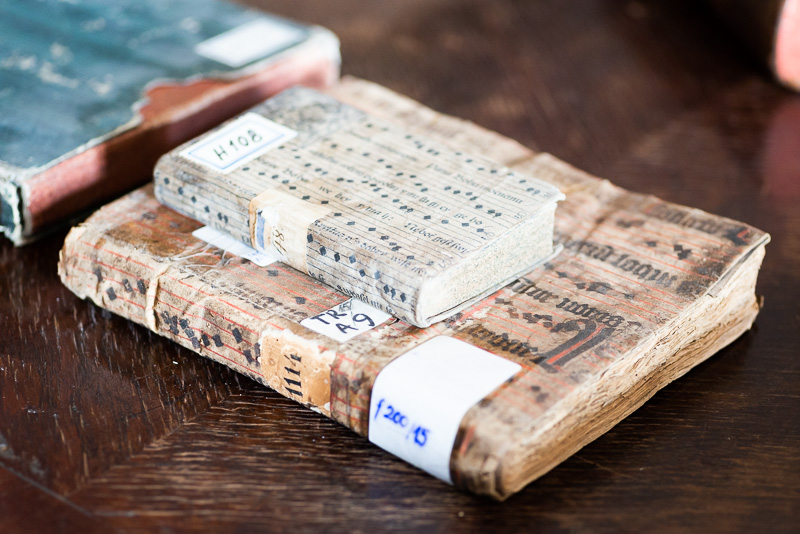 Pergamen z 15. storočia, kedysi znotovaný kancionál, ktorý slúži ako obal na inú knihu. Snímka: Erika Litváková