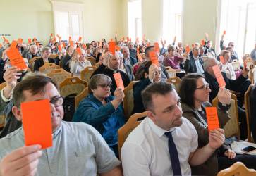 Hlasovalo sa aj o návrhu zvýšenia členského príspevku. Táto téma rozvírila aj najväčšiu diskusiu. Snímka: Erika Litváková