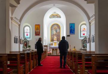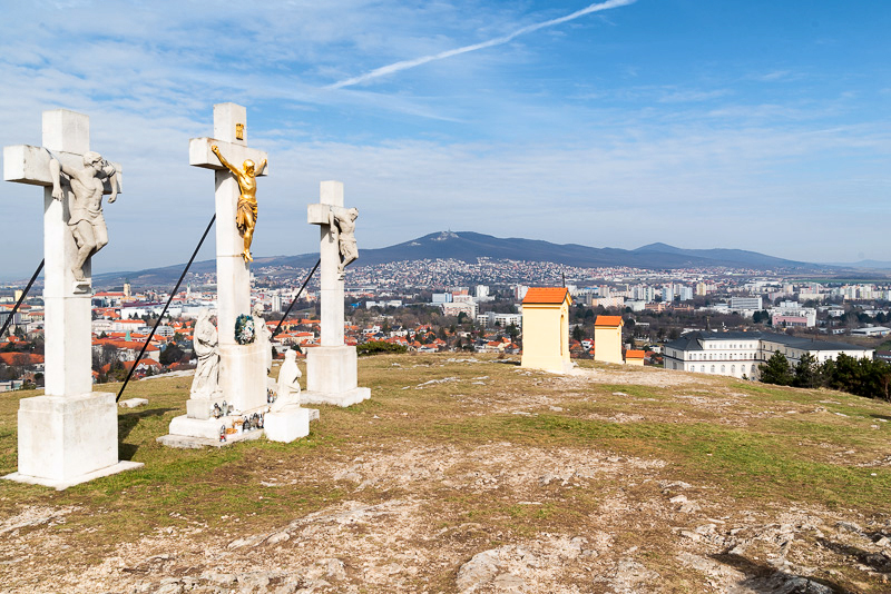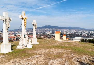 Páter Kušnír sa s nami na vrchole kalvárie podelil o zaujímavú skúsenosť. Jedna sestra tu stretla dvoch mladíkov, zrejme tu boli prvýkrát. Jeden druhému hovoril: „Pozri, ten zlatý muž na kríži má pribité ruky.“ Snímka: Erika Litváková