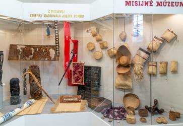 Jedno oddelenie venoval múzeu kardinál Jozef Tomko. Štólu s vyšitým menom, pestrofarebné košele, paškál, vyrezávané reliéfy, tkaniny, palice aj sošky. Snímka: Erika Litváková