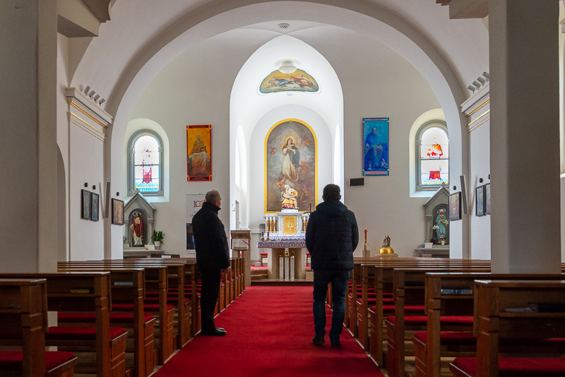 Oltár farského kostola okrem obrazu Nanebovzatia Panny Márie zdobí aj socha Piety. Po pravej strane vidíme obraz zakladateľa verbistov Arnolda Janssena a vľavo prvého misionára Jozefa Freinademetza. Snímka: Erika Litváková