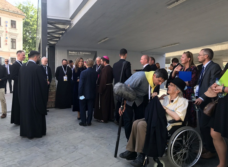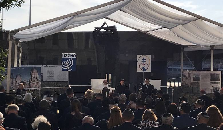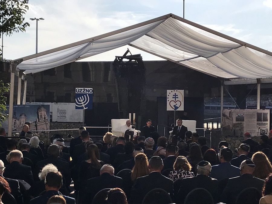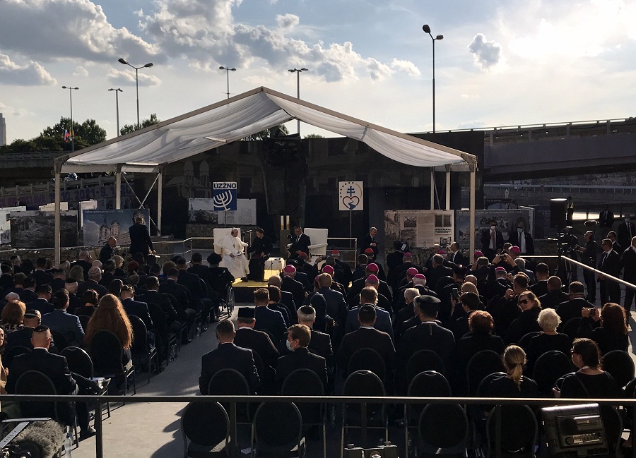 Na Rybnom námestí v Bratislave sa v pondelok 13. septembra stretol pápež František so židovskou komunitou. Vypočul si dve svedectvá a uctil si obete holokaustu.