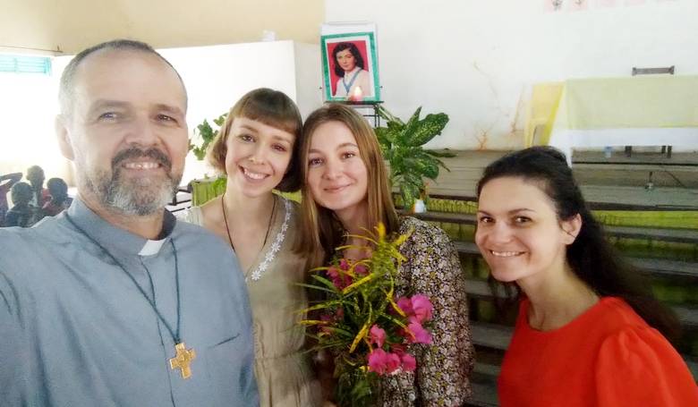 Štefan Kormančík, SDB, a tri slovenské dobrovoľníčky, ktoré budú rok pôsobiť v Južnom Sudáne. Sprava Veronika Maximová, Alexandra Kušnírová a Barbora Mária Pečková. Snímka: Štefan Kormančík