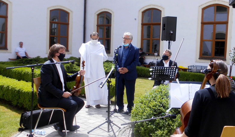S priorom rehole milosrdných bratov Richardom Jombíkom na jednom z koncertov v nemocničnej záhrade v dobe pandémie. Snímka: Andrea Eliášová