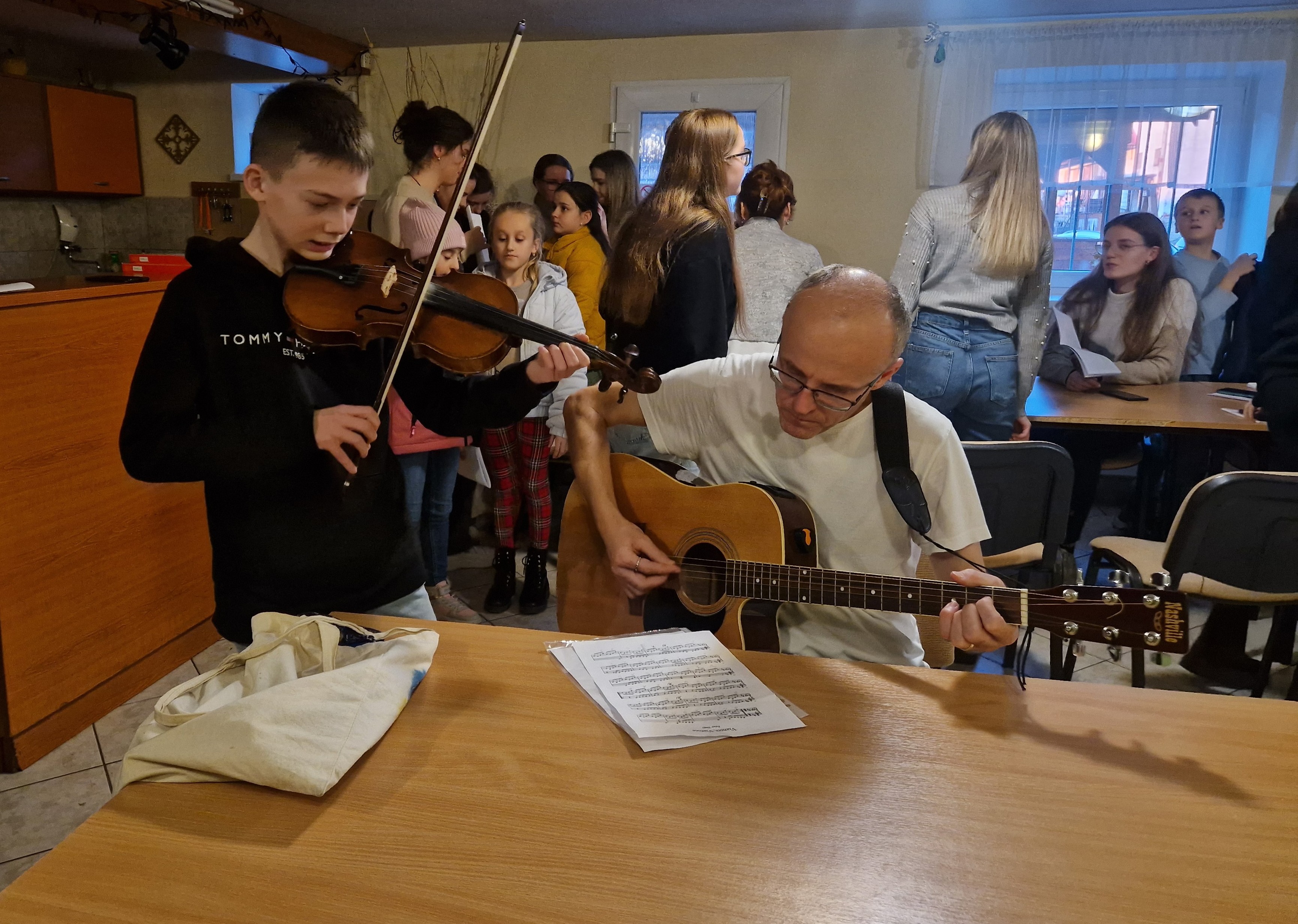 Huslista Filip a hlavný gitarista Andrej pri nácviku piesne Vianoce, Vianoce. Snímka: autorka
