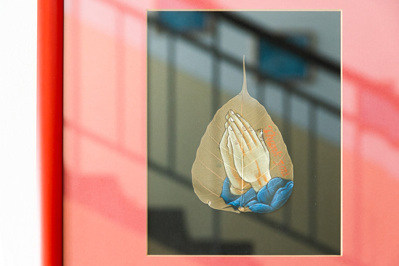 Kráčajúc hore schodmi nechávame pohľad na netradičných obrazoch. Namiesto plátna použil umelec obyčajný list zo stromu. Výsledok je úchvatný.