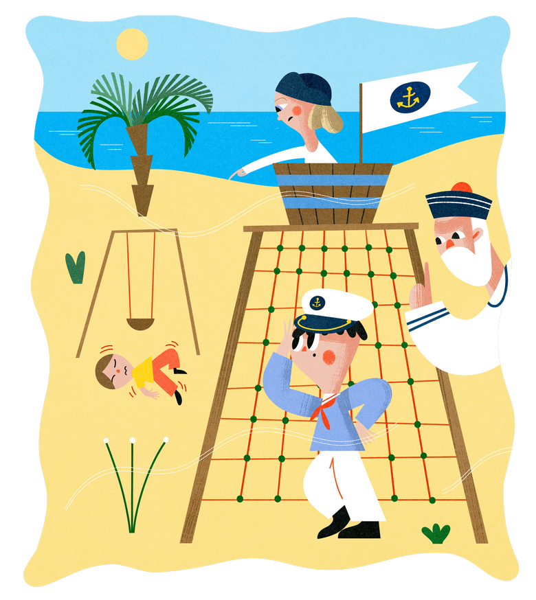 D: Pozriem sa cez svoj ďalekohľad. Napravo nič, naľavo... Oli! Pri hojdačke jeden chlapec spadol na zem a trasie sa. Utekajme tam!