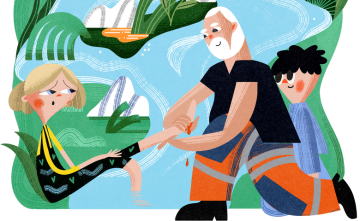 V: Výborne, Dori. A teraz poď ty, Oli. Skús ju uložiť do stabilizovanej polohy. Vieš, ako na to?