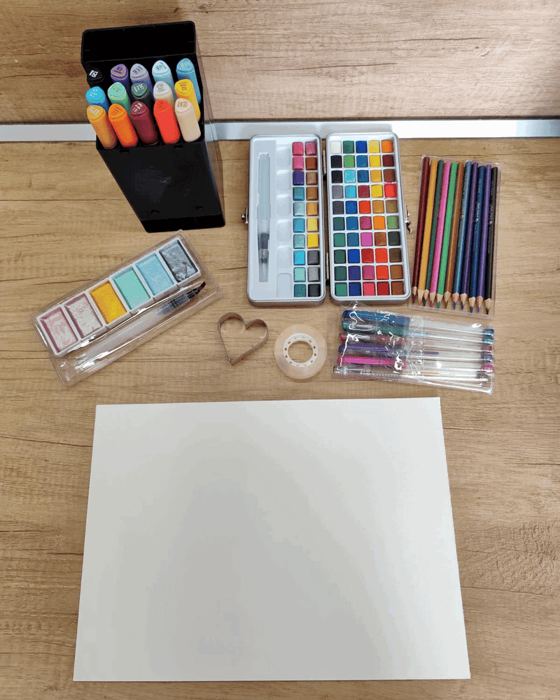 Budete potrebovať výkres, užšiu lepiacu pásku, vykrajovačku na pečenie v tvare srdca, ozdobné pero a vodové, prípadne akvarelové farby.