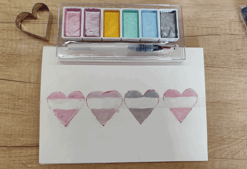 Najprv si vyzdobíte obálku tejto pohľadnice. Približne cez jej stred nalepíte užšiu lepiacu pásku. Nafarbíte spodnú časť srdiečkovej formičky a jemne ju odtlačíte na papier tak, aby cez stred srdiečka prechádzala lepiaca páska. Podobným spôsobom odtlačíte tri až štyri srdiečka. Všetky ich potom vymaľujete.