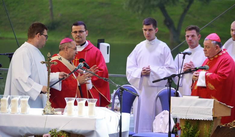 Pri vodnej nádrži Domaša slávili aj svätú omšu. Medzi celebrantmi bol arcibiskup Bernard Bober (druhý zľava) a kardinál Dominik Duka (prvý sprava). / Snímka: Imrich Mako