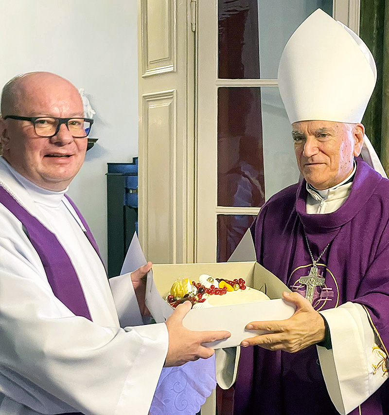 Pri príležitosti sviatku svätého Mikuláša riaditeľ Spolku svätého Vojtecha Ivan Šulík obdaroval apoštolského nuncia Nicolu Girasoliho sladkou dobrotou. Snímka: Martina Grochálová