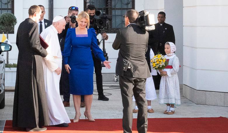 Pápeža Františka na nádvorí Prezidentského paláca privítala prezidentka Slovenskej republiky Zuzana Čaputová spolu s deťmi v krojoch. Snímka: prodimedia.sk
