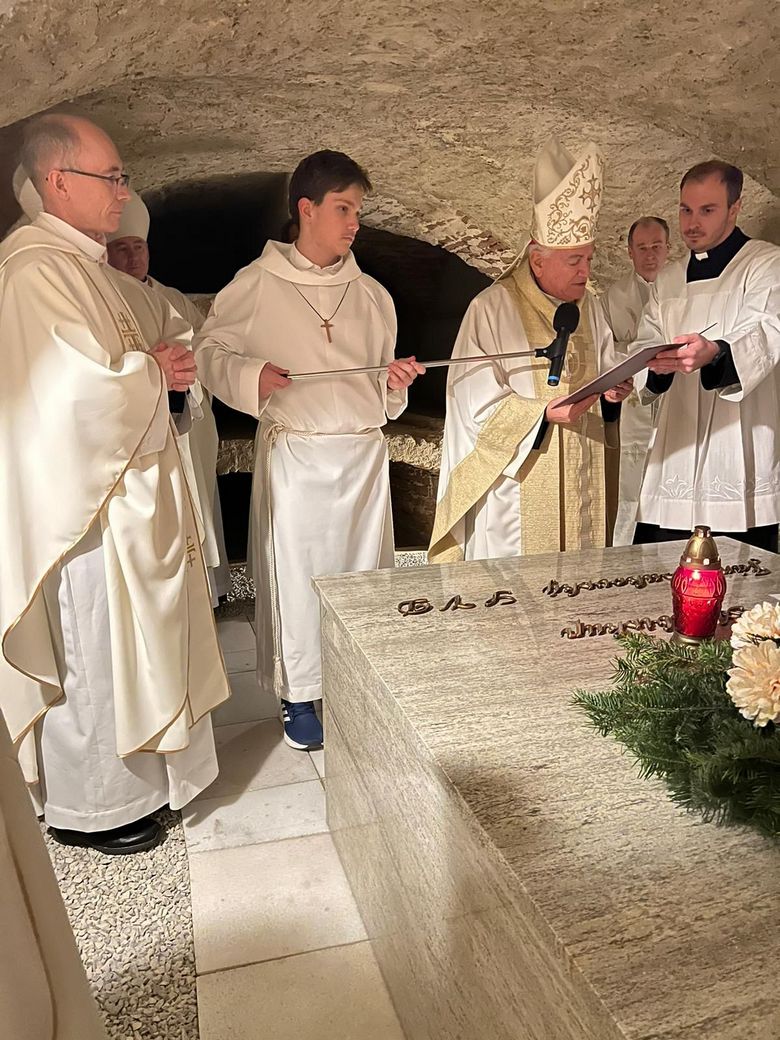Apoštolský nuncius Nicola Girasoli počas modlitby pri hrobe arcibiskupa Jána Bukovského. Snímka: archív SVD
