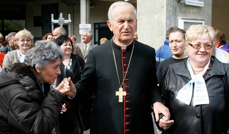 Kardinál Jozef Tomko medzi veriacimi na Prvej národnej púti v Lurdoch v októbri 2008. Snímka. -TK KBS-/Peter Zimen