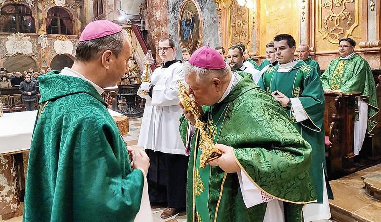 Nitriansky biskup Viliam Judák si uctil bozkom relikvie blahoslavenej Gizely, ktoré Nitrianskemu biskupstvu daroval veszprémsky arcibiskup György Udvardy. Snímka: Tibor Ujlacký